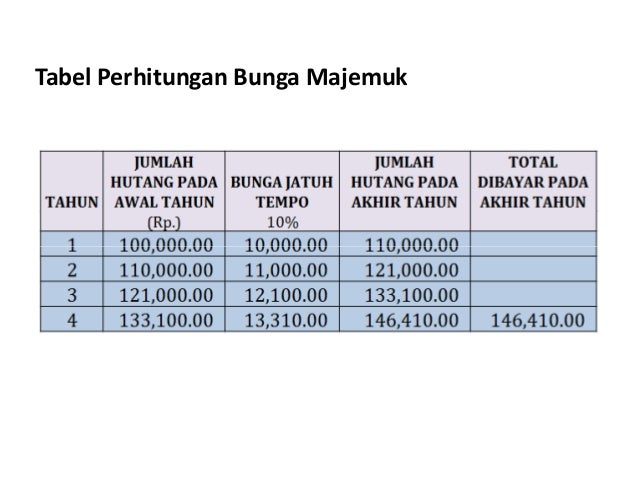 Contoh soal future value bunga majemuk. Sedangkan compound interest bunga berbunga bunga majemuk adalah bunga yang anda dapatkan dari investasi anda saat ini dan dari akumulasi investasi tersebut. Jika anda menyimpan uang di bank sebesar rp 1000000 selama 1 tahun dan memperoleh bunga 15 per tahun maka pada akhir tahun anda akan mendapatkan rp 1150000. Pada artikel kali ini kita hanya berfokus pada latihan soal dan pemecahannya.