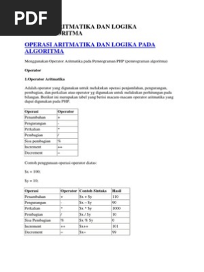 Operator merupakan intruksi khusus yang dikenai untuk variable. Berikut ini merupakan tabel yang berisi macam macam operator. Operasi aritmatika dan logika pada algoritma menggunakan operator aritmatika pada pemrograman php pemrograman algoritma operator 1operator aritmatika adalahoperator yang digunakan untuk melakukan operasi penjumlahan pengurangan pembagian dan perkalian atau operator yg digunakan untuk melakukan perhitungan pada bilangan.