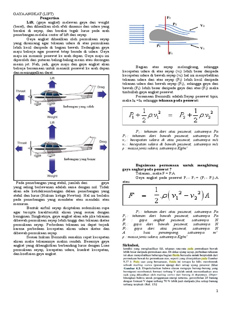 Akibatnya tekanan bagian atas lebih kecil dibandingkan tekanan bagian bawah. Mencakup debit persamaan kontinuitas hukum bernoulli dan toricelli dan gaya angkat pada sayap pesawat. Berat pesawat yang disebabkan oleh gaya gravitasi bumi 2.
