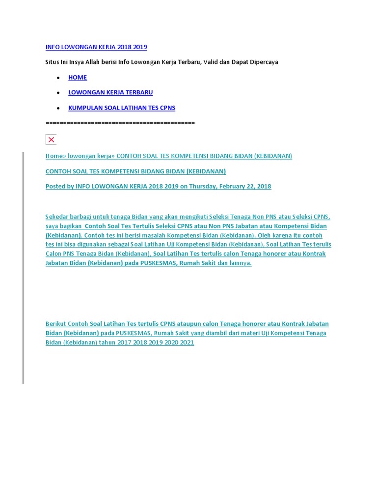 Contoh soal tkb formasi bidan. Formasi cpns 2018 seluruh wilayah indonesia tes pengetahuan umum. Oleh karena itu contoh tes ini bisa digunakan sebagai soal latihan uji kompetensi. Prediksi soal cpns bidan 2018 tes latihan online dan jawaban soal cpns.