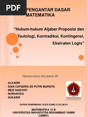 Makalah yang berjudul hukum aljabar proposisi dan tautologi kontradiksi kontingensi ekuivalen logis bertujuan untuk mengetahui hukum hukum aljabar proposisi serta operasi yang ada dalamaljabar proposisi tersebut. U p u q hukum identitas. Hukum asosiatif pada hukum aljabar bilangan real adalah a b c a b c yang berlaku juga untuk operasi perkalian.