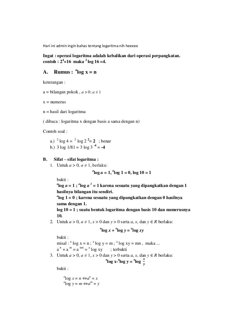 Rumus sifat fungsi persamaan dan contoh soal belakangan ini ilmu matematika telah berkembang pesatbukan hanya sebatas hitung menghitung menggunakan skala statistik nilai angka angka real kalkulus dan peluang. Dari kedua soal di atas maka diperoleh nilai m dan n sebagai berikut. Semoga artikel cara mudah menyelesaikan logaritma ini dapat bermanfaat dan pelajari juga artikel sebelumnya mengenai cara mudah mengerjakan pertidaksamaan eksponen.