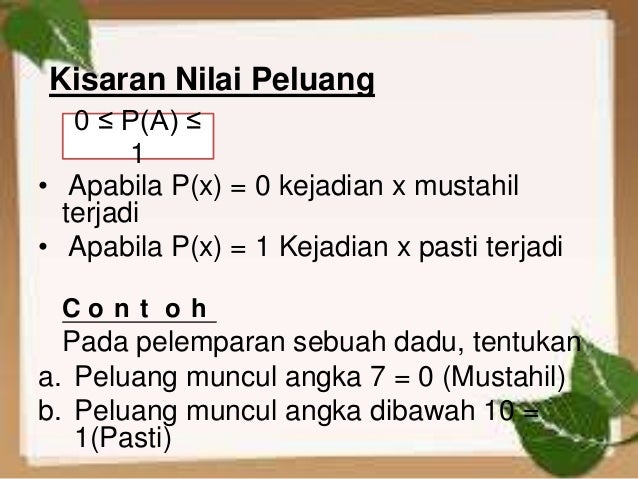 Nilai peluang suatu kejadian adalah 0 pa 1 dengan a merupakan kejadian pada percobaan tersebut. Pelajari bersama yu apa itu kisaran nilai peluang. Secara sederhana kisaran nilai peluang dapat diartikan sebagai perkiraan kemungkinan munculnya suatu kejadian di dalam sebuah ruang sampel.
