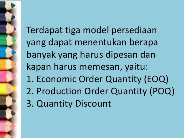Model quantity discount membantu dalam membuat keputusan tersebut. Economic order quantity eoq adalah jumlah pembelian yang paling ekonomis economical order quantity eoq definisi. Biaya pesan untuk setiap kali melakukan pemesanan sebesar rp150000 sedangkan biaya penyimpanan sebesar 25 dari nilai rata rata persediaan.