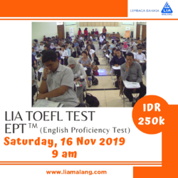 Kelas persiapan tes toefl ini dirancang khusus oleh departemen esp english for specific purposes lembaga bahasa lia untuk mereka yang sedang mempersiapkan diri untuk mengambil tes toefl baik untuk keperluan studi lanjut di dalam dan luar negeri maupun untuk tujuan tujuan okupasional seperti persyaratan penerimaan pegawai promosi jabatan dan sebagainya. I suggest you register long time before the test day so you can prepare your self. I registered at lia galaxy bekasi one week before the tast.