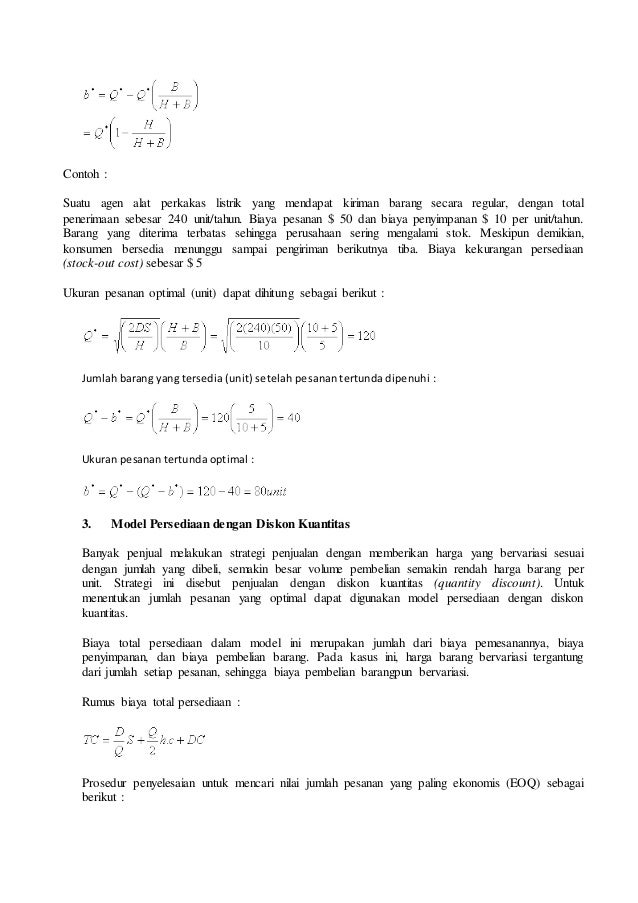 Berikut ini adalah contoh soal quantity discount model yang bisa anda unduh secara gratis dengan menekan tombol download yang ada pada tautan dibawah ini. Biaya simpan yang terjadi sebesar rp 075utahun. Diketahui sebuah perusahaan memiliki kebutuhan bahan baku sebesar 20000 unit per tahun.