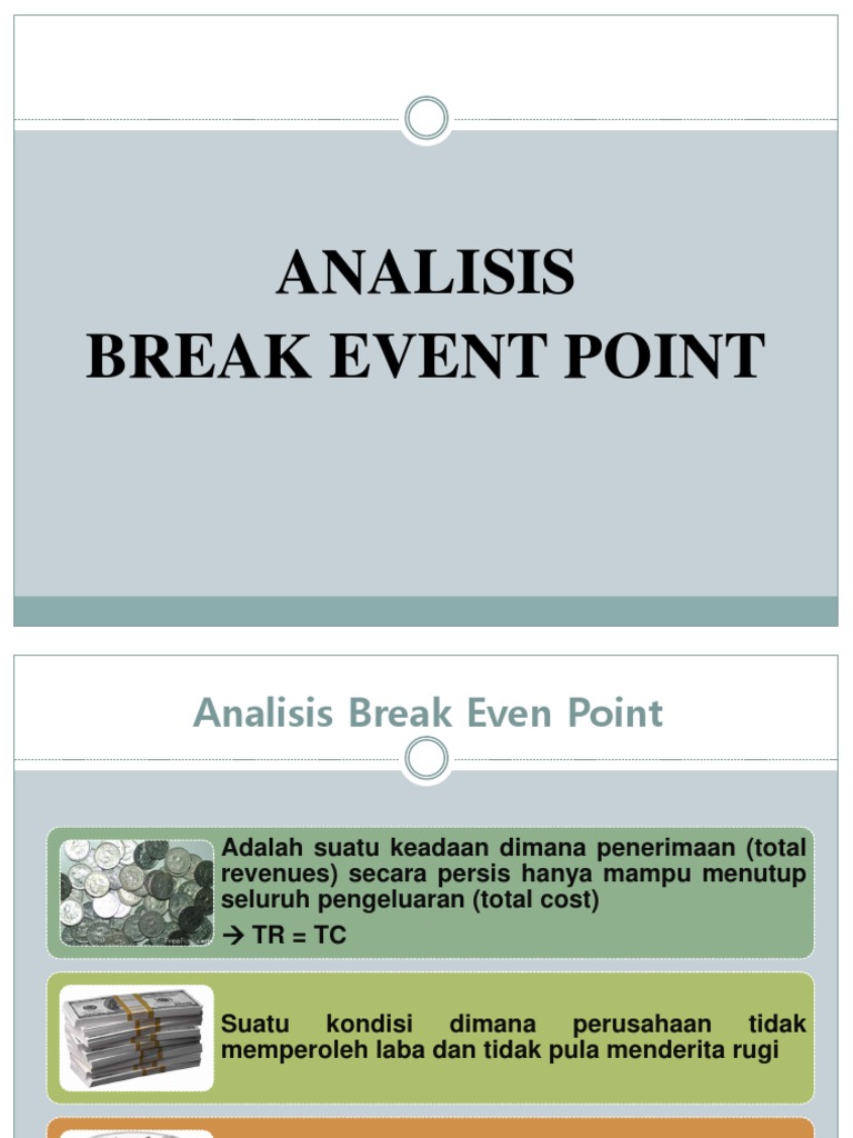 Break even point bep dapat diartikan sebagai suatu titik atau keadaan dimana perusahaan di dalam operasinya tidak memperoleh keuntungan dan tidak menderita kerugian. Analisa break event point bep adalah titik dimana perusahaan belum memperoleh keuntungan tetapi juga tidak dalam kondisi rugi. Analisis bep mempunyai hubungan yang sangat erat dengan program budget walaupun analisa bep dapat diterapkan dengan data historis tetapi akan sangat berguna bagi manajemen jika diterapkan pada taksiran periode yang akan datang.